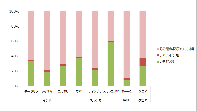 紅茶は、産地によって品種、製法、酸化発酵の程度が異なります。そのため、紅茶ポリフェノールを構成する成分の比率にも違いがあり(図2)、各紅茶産地によって特徴的な香味や水色を呈するようになります。例えば、ヌワラエリヤは発酵度が浅いため淡く明るいオレンジイエローの水色を呈し、緑茶にやや似たすっきり爽快な渋みがあります。ウバは、明るく赤みのあるオレンジ色で、刺激的な渋味がある力強い味わいです。ケニアは、湯を注ぐと直ぐに色が出て、赤みが強い鮮やかな水色が特徴です(図3)。